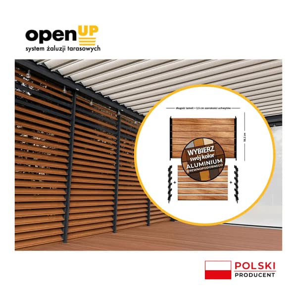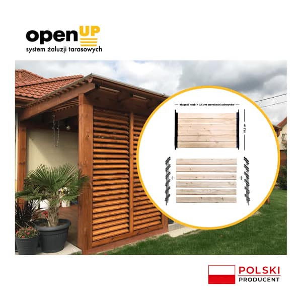 Uchwyty do ruchomych żaluzji zewnętrznych OpenUpSystem to system, dzięki któremu zrobisz zewnętrzne shuttersy z drewna lub aluminium do zabudowy tarasu, balkonu, wiaty czy altany. Konstrukcja uchwytów umożliwiają płynny ruch drewnianych deseczek lub lameli. System uchwytów z wklikanymi w nie deseczkami lub aluminiowymi lamelami pozwoli szybko zbudować ruchomą ścianę.